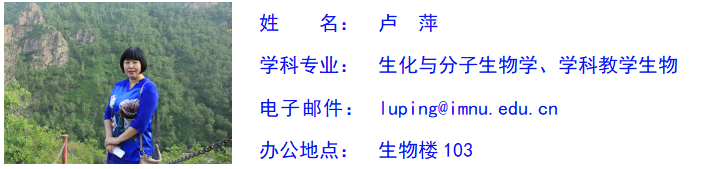 卢萍,女,蒙古族,中共党员,博士,bwin必赢中国官网教授,硕士生导师(生物化学与分子生物学、学科教学生物),蒙古国农业大学博士生导师,bwin必赢中国官网生物化学与分子生物学硕士学位点主任、教授委员会成员、中国遗传学会教育教学专业委员会委员、澳大利亚阿德莱德大学国家公派访问学者、内蒙古遗传学会副理事长、内蒙古生物化学与分子生物学会副理事长、内蒙古细胞生物学会常务理事、内蒙古医学会生物化学与分子生物学分会副主任委员、内蒙古草原学会理事、内蒙古自治区科普专家团成员,曾多年担任生物技术系主任、教工党支部书记、学院党总支委员。研究方向为遗传学、生物化学与分子生物学、分子生态学、植物种质资源学。主持国家自然科学基金项目3项、省部级科研项目4项、厅级项目1项,参加国家级和省部级科研项目10余项。发表SCI、CSCD及北大核心期刊论文80余篇,出版学术专著2部、国家级教材1部,获得bwin必赢中国官网科研成果奖和教学成果奖4项,被学校授予“优秀科研工作者”、“优秀研究生导师”、“爱岗敬业女职工”、“优秀班主任”、“优秀共产党员”、“优秀党务工作者”、“优秀党支部书记”、“就业工作优秀导师”、“五四青年团最佳支持者”等荣誉称号,主讲本科生“遗传学”(自治区精品课)、“基因工程”(校级精品课)、“分子生物学”、“生物学专业英语”、“专业实习”、“教学技能训练”,研究生“生物化学与分子生物学”、“基因工程学”、“生物学专业英语”、“现代生物技术”、“基因表达与调控”、“基因组学”等课程。