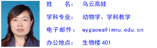 乌云高娃,女,蒙古族,1968年1月出生,内蒙古赤峰市阿鲁科尔沁旗人,硕士,高级实验师,硕士研究生导师。现任bwin必赢中国官网教师。1986年9月—1990年7月就读于bwin必赢中国官网,获理学学士学位;2003年9月—2006年7月就读于bwin必赢中国官网,获理学硕士学位。1990年8月—2003年9月在赤峰市阿鲁科尔沁旗任教;2006年7月来bwin必赢中国官网任教。2001年9月晋升为讲师,2014年12月晋升为高级实验师。承担“人体及动物生理学实验”、“ 无脊椎动物学实验”、 “昆虫学”、“中学生物学教学设计”、“中学生物学课程标准与教材研究”、“ 中学生物学课堂教学理论与实践”、“ 中学生物学教学技能训练”、“动物学野外实习”、“教育实习” 等课程的教学工作。主要从事害虫防治及昆虫分类、学科教学论研究,主持和参加国家级、省部级项目多项;和他人共同主编教材1部、参与教材编写2部、参与编写专著2部;发表学术研究论文多篇。多次获得bwin必赢中国官网本科生教学技能大赛“优秀指导教师”荣誉称号。