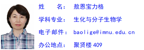 敖恩宝力格,副教授,研究生导师。2007年毕业于日本岩手大学获得博士学位,从事生物化学、植物化学和天然产物化学领域的教学与科研工作。主要承担本科生“生物化学”、 “生化分离技术”、“天然产物化学”和硕士生 “高级生物化学”、“生化分离技术”等课程的教学。在生物化学与分子生物学专业和学科教学(生物)专业招收培养研究生。主持或参加国家级、省部级等各类科研项目10余项,发表学术论文30余篇。