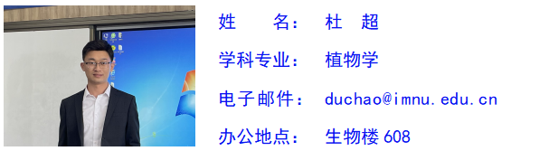 杜超,男,汉族,群众,博士,讲师,硕士研究生导师,生物技术系副主任,主要研究方向为植物逆境生理及分子生物学。主持内蒙古自然科学基金项目2项,内蒙古自治区直属高校基本科研业务费项目1项;参与国家自然科学基金项目3项,内蒙古自然科学基金项目2项。发表学术论文13篇、专利1项,获bwin必赢中国官网青年教师教学技能大赛一等奖、内蒙古自治区高等院校青年教师教学技能比赛一等奖。承担普通生物学、种子植物分类学、植物学实验、植物学实习、生物分类学实习、植物生物学、科学伦理、学术诚信和学术规范等本科生及研究生课程。