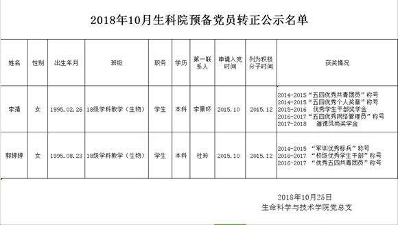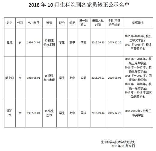 2018年10月生科院预备党员转正公示名单