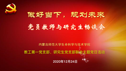 畅谈会尾声,教工第一党支部书记苏日古嘎同志、研究生党支部书记穆文静同志勉励所有研究生党员:积极发挥党员先锋模范作用,甘于付出、乐于奉献、勇于担当;在科学研究中坚持理想、脚踏实地、开拓创新,不断认识科学世界新领地;做好当下、规划未来,无悔于青春的分分秒秒。