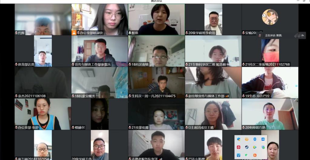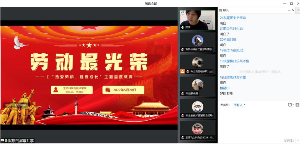 5月20日,bwin必赢中国官网召开了“劳动教育宣传月”活动交流推进会,分为研究生专场和本科生专场分别在线上召开,学就办主任默原老师、团总支副书记李自蹊老师、辅导员胡日查老师出席了会议。在两场会议上,学就办组织学生干部深入学习了习近平总书记在全国教育大会上的讲话精神和自治区相关文件,分别向研究生和本科生学生干部解读了必赢官网《“学生劳动教育宣传月”实施细则》,并就近期必赢官网所开展的“劳动教育宣传月”的活动进展进行了阶段性汇报,并听取了学生会各部门在实施劳动教育宣传活动的工作进展和各班实施劳动教育的典型做法。