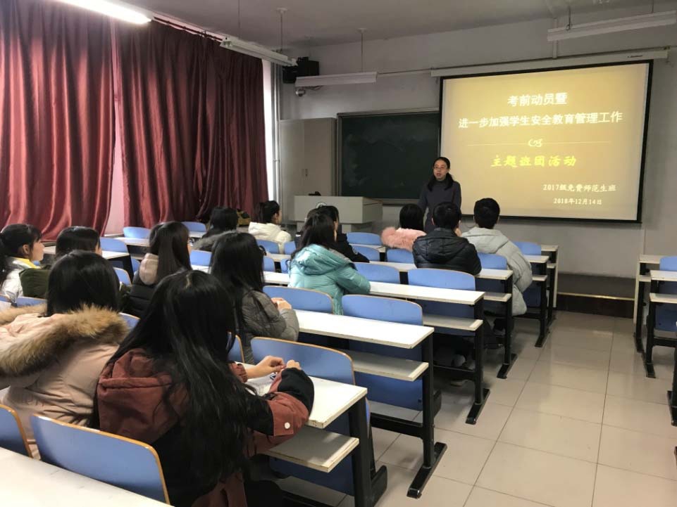按照学校要求,根据必赢官网《关于组织开展考前动员大会暨进一步加强学生安全教育与管理工作的通知》文件精神,为进一步加强院风、学风建设,维护学院正常的教学和生活秩序,保障学生的人身、财产安全和身心健康,2018年12月13—17日期间,必赢官网各班以主题班会或团日活动的形式举行了“考前动员大会暨进一步加强学生安全教育与管理工作”的主题活动。
