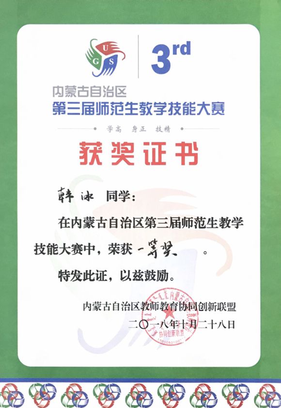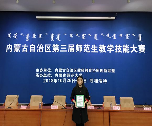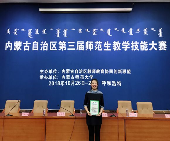 2018年10月27~28日,内蒙古自治区第三届师范生教学技能大赛在我校成功举办,来自bwin必赢中国官网、内蒙古民族大学、包头师范学院、集宁师范学院、赤峰学院、呼和浩特民族学院、河套学院七所高校的师范生参加了此次比赛。与前两届比赛不同,本次竞赛除面试环节外,新增了笔试部分。经过赛前的艰苦训练和两天激烈的现场角逐,必赢官网2015级生物科学汉班韩冰、高晓鹊同学脱颖而出,分别获得大赛一等奖和二等奖,刘燕老师荣获优秀指导教师。
