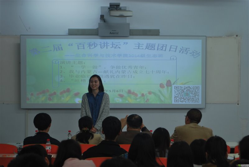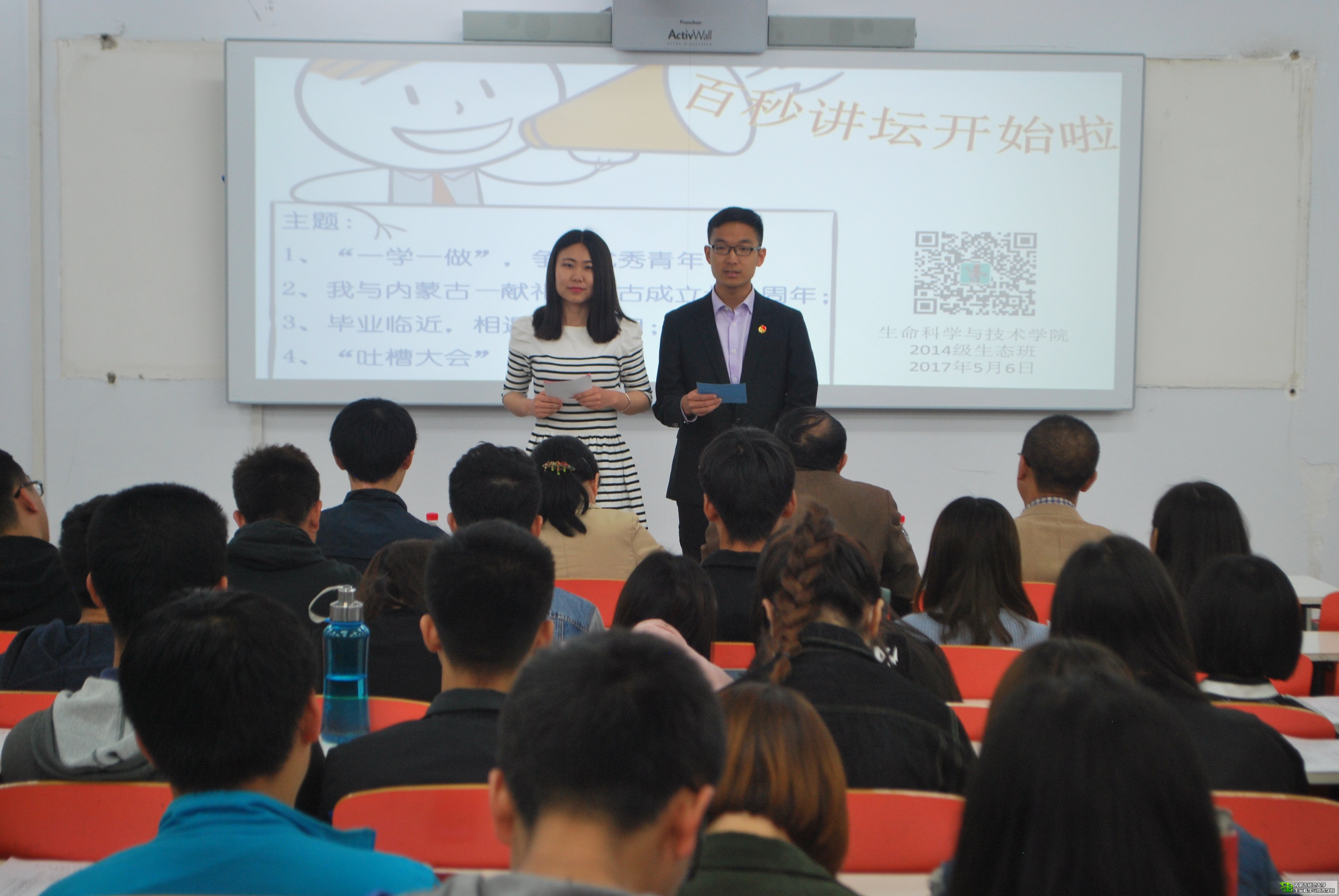 5月6日上午10点,由共青团bwin必赢中国官网委员会主办,bwin必赢中国官网承办的bwin必赢中国官网第二届“百秒讲坛”主题团日活动展示观摩在赛罕校区、盛乐校区同时举行,分别由必赢官网2014级生态班团支部和2015级生物技术班团支部做了精彩展示。必赢官网党总支副书记莎日娜老师、宣传部边建平老师、各班级李敏、牧仁、董河鱼、吴榕、田桂泉、袁博、吕桂芬、白晓栓等任课老师以及学院学生会和学生党支部同学受邀参加了活动,各学院2014级、2015级、2016级团支部书记、组织委员、宣传委员等354名同学前来观摩。 “百秒讲坛”主题团日活动展示观摩围绕拟定主题,以班团成员百秒演讲;现场观众全体投票(插播才艺展示);特邀嘉宾精彩点评;“最具人气奖”颁奖仪式等环节,完整的呈现了“百秒讲坛”的各个流程。两个团支部的主题分别为“‘一学一做’,争做六有好青年:我与内蒙古—献礼内蒙古成立七十周年:毕业临近,相遇犹在昨日”和“学习总书记讲话,争做六有大学生;我所坚持的;小长假旅游攻略”。最后,团支部书记陈彦廷和班长张凯慧同学还介绍了“百秒讲坛”主题团日活动的组织要求、注意事项、 “百秒讲坛”微信公众号和视频制作的方法。2015级生物技术班同学们还在行知楼前面拼接成“100S”字样,进行了航拍。 本次展示观摩为“百秒讲坛”主题团日活动的全校普及、基层团支部的活力提升、团员青年的能力提高起到了积极的推动作用。