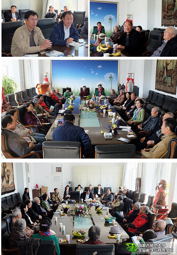 参观活动结束后,召开了座谈会,学院党总支书记恩和主持会议并致欢迎词,学院院长哈斯巴根介绍了学院师资队伍建设、本科专业和教学建设、科学研究、学位与研究生教育工作等各方面的发展现状,并感谢前辈们在学院的建设和发展中做出的历史性贡献。参加活动的老教师们对学院这些年的建设和发展感到欣慰并给予了高度评价。我校原副校长、植物学家和草地科学家陈山先生感叹道:学院这些年在院领导班子和全体师生的共同努力下发展快,成绩显著。今天开展这样有意义的活动,一方面让我们这些老同志难得相聚了一次;另一方面,学院的发展令我们有耳目一新的感觉,在标本馆展厅看到了我在1959年5月7日从巴丹吉林沙漠拐子湖采集到的编号38号肉苁蓉标本,感到特别亲切;我校原副校长、著名昆虫学家能乃扎布先生说道:学院的发展离不开老先生们的贡献,更离不开中青年继任者们的坚持不懈和出色的工作。很多老教师在自己曾经工作过的场所驻足回忆当年的情景。当年仪器室主任、现年87岁高龄的杨巨鸿老师看到学院仪器设备的升级变化感慨万千,不断地点头称赞。老教师们相互见面格外开心,相互问寒问暖关心彼此境况。
