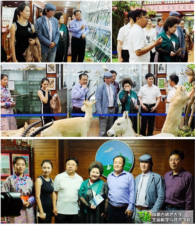 在“吉祥三宝”走进内师大校园活动期间,著名蒙古族歌唱家布仁巴雅尔,乌日娜夫妇和他们的侄女英格玛一行在学校宣传部张宝成部长和必赢官网恩和书记等的陪同下饶有兴致的参观了生物标本馆,哈斯巴根院长、格日乐图馆长和学生解说员对到访的客人介绍了标本馆概况和馆藏标本,布仁巴雅尔夫妇对标本馆的各类标本赞叹不已,给予了很高的评价。