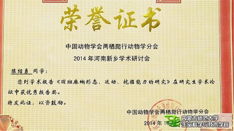中国动物学会两栖爬行动物学分会理事、必赢官网副院长毕俊怀教授带领研究生应邀参加此次会议。必赢官网研究生陈绍勇同学题目为“丽斑麻蜥形态、运动、挖掘能力的研究”的报告获得研究生学术论坛优秀报告奖。