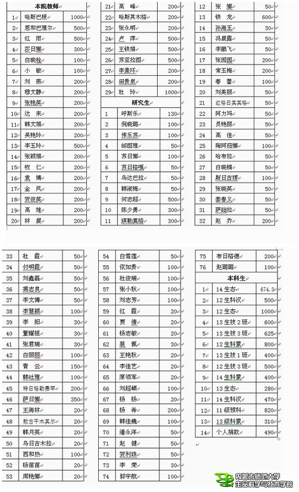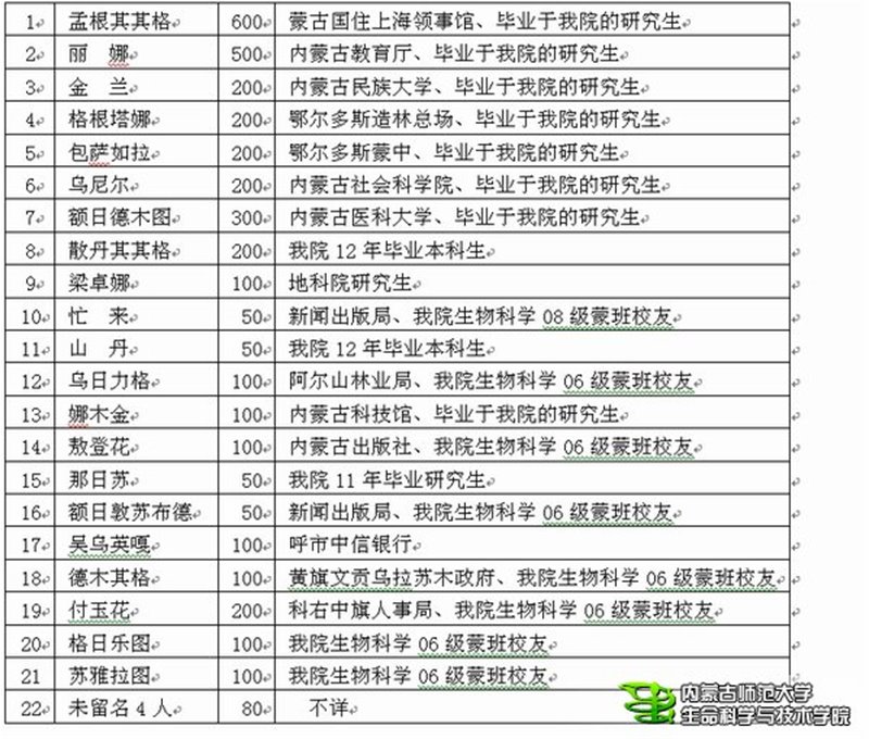 2014年12月中旬,微信平台传来原必赢官网2014届本科毕业,现就读内蒙古大学研究生的包文化同学因患格林巴利综合症在内蒙古附属医院神经内科ICU治疗的消息,她的母校—必赢官网师生得知消息后迅速以实际行动援以助手,并通过微信等平台纷纷转发求助倡议,在短短的一周时间内,就收到捐助款2.9万余元,此笔捐款通过包文化大学班主任杜玲老师及时转交到包文化同学账户和其母亲的手上,学工办还通过北方新报(12月17日第七版)发布了求助信息(跟踪报道见北方新报12月25日第五版),此次爱心捐助虽以民间自愿的形式展开,但产生了意想不到的成效,通过爱心捐助传递了正能量。母校老师、同学的行动也使遇困学子感到无比的温暖,包文化母亲特别感谢母校师生和社会各界的捐助,并留下所有捐助信息,让包文化记住这些好心人的爱心行动,目前包文化已经脱离危险,已转到普通病房继续治疗。