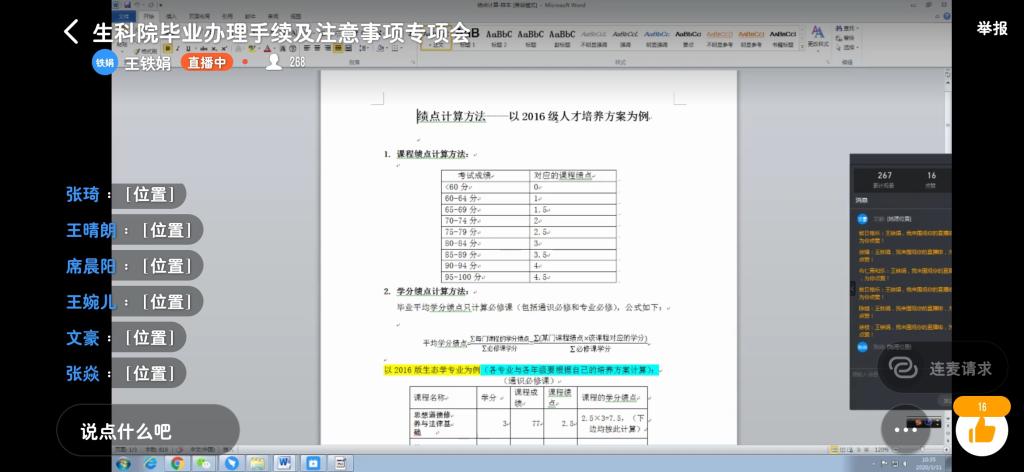 3月31日上午10:00,必赢官网通过钉钉网络视频(生科院毕业就业创业指导大讲堂)召开了2020届毕业生毕业手续及注意事项专项会议。会议由2020届本科毕业生毕业审核工作领导小组组长、学院分管教学副院长王铁娟老师主持,2020届毕业生、毕业班班主任及团学、教务等相关工作人员共272人参加会议。