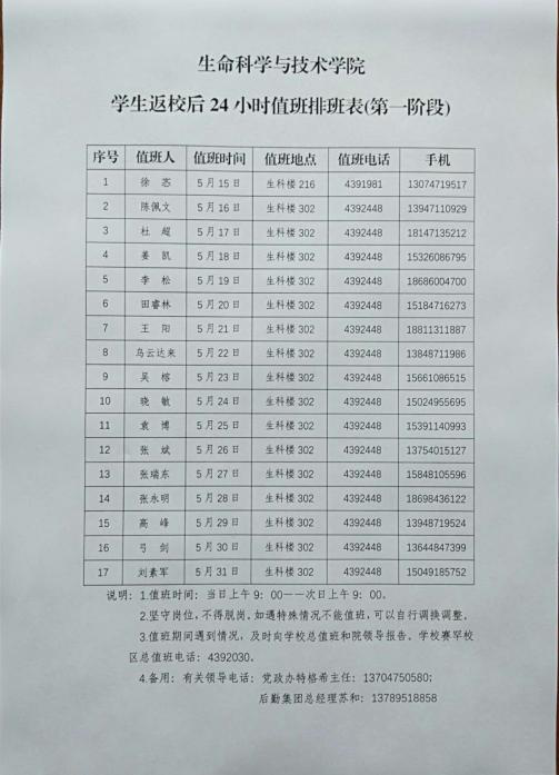 为落实学校的工作部署,做好学生返校后的安全防护,防止出现特殊情况,学院安排了24小时值班人员,做到发现问题及时上传下达,采取应对措施。