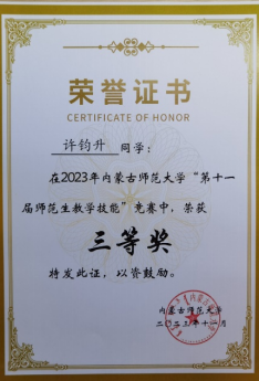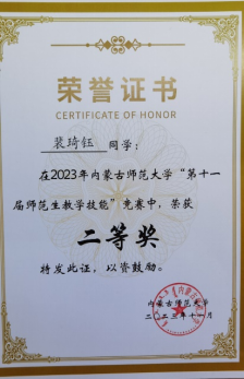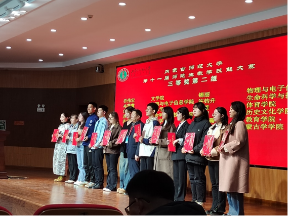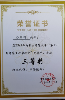 bwin必赢中国官网“第十一届师范生教学技能”竞赛于2023年11月4—5日在盛乐校区隆重举行,在本次比赛中,必赢官网经过层层选拔,选派2020级生物科学汉2班的裴琦钰、许钧升和2021级生物科学蒙班的苏日娜共三名同学参加了本次技能大赛,指导教师为李景环、牛艳芳、高峰和乌云高娃。经过赛前师生的精心准备和赛场上的激烈角逐,最终裴琦钰同学获得二等奖,许钧升和苏日娜同学获得三等奖。 奖获者荣誉证书 二等奖获得者合影 三等奖获得者合影