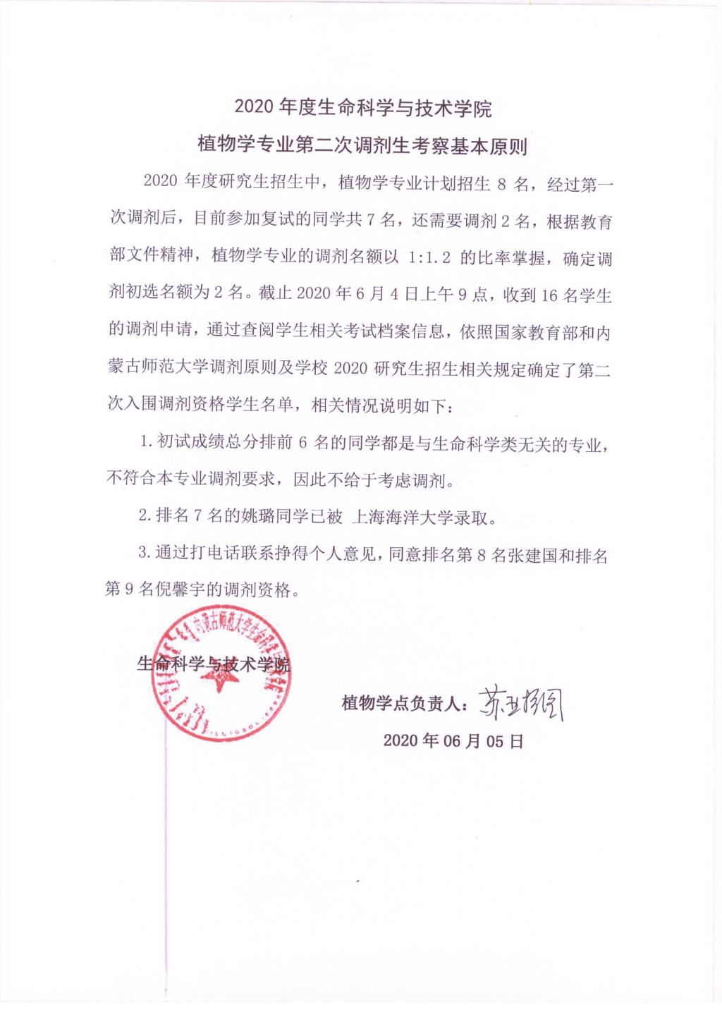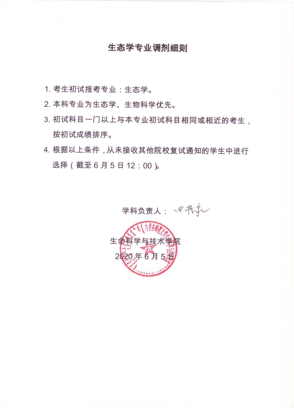 2020年国家研究生招生考试bwin必赢中国官网植物学、动物学、生物化学与分子生物学、生态学第二次调剂原则