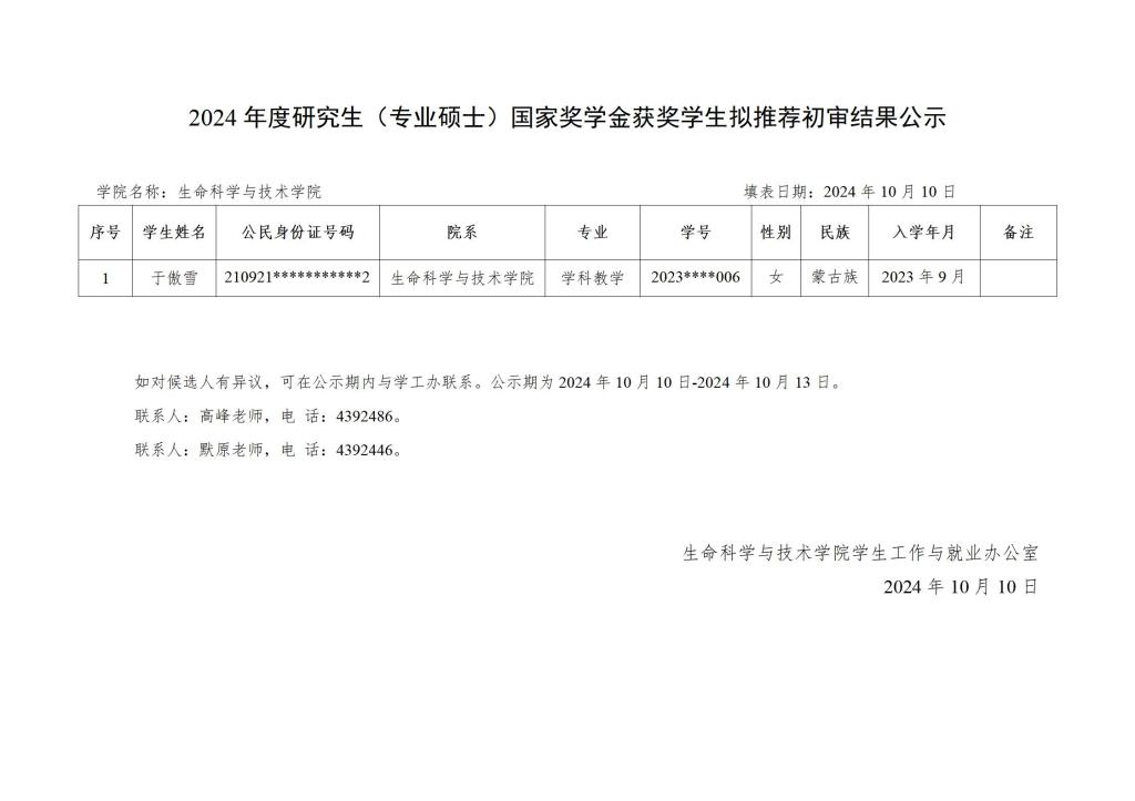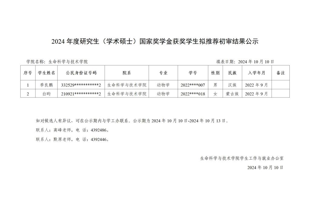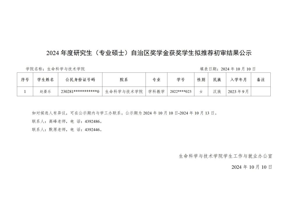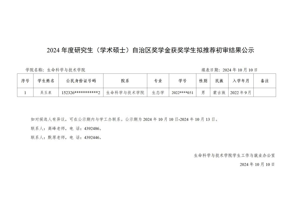 2024 年度研究生国家奖学金、自治区奖学金获奖学生拟推荐初审结果公示